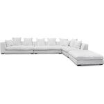 Besonders hervorzuheben ist das Chaiselongue-Element am Ende des Sofas, das zusätzlichen Raum für Entspannung bietet. Die gesamte Struktur des Sofas ruht auf schlichten, unauffälligen Füßen, die das Design nicht überladen und die optische Schwere auf die voluminösen Polster- und Kissenpartien legen.