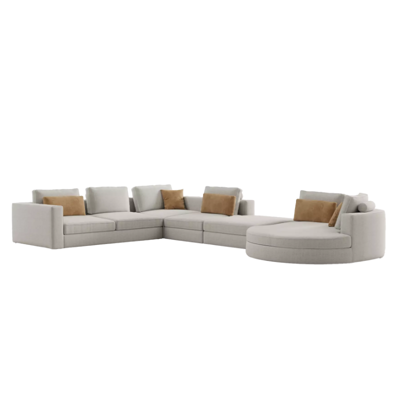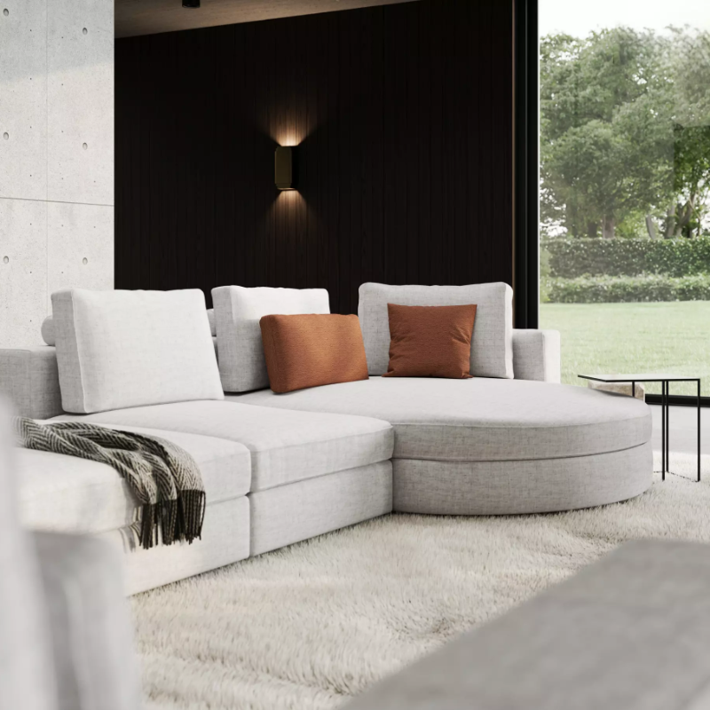 Das Sofa Aluna ist eine beeindruckende Mischung aus modernem Design und ultimativem Komfort. Mit seiner großzügigen L-Form bietet es viel Platz für die ganze Familie oder gesellige Zusammenkünfte. Der helle, neutrale Stoffbezug verleiht dem Sofa eine zeitlose Eleganz, während die weichen, voluminösen Kissen für ein entspanntes Sitzerlebnis sorgen. Ein besonderes Highlight ist die abgerundete Chaiselongue, die dem Sofa einen Hauch von Luxus und Exklusivität verleiht. Die klaren Linien und das minimalistische Design machen das Sofa Aluna zur idealen Wahl für moderne Wohnräume, die eine Balance zwischen Stil und Gemütlichkeit suchen.