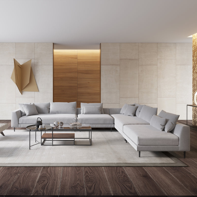 Die Polsterung erscheint fest und doch bequem, unterstützt von mehreren losen Rückenkissen, die sowohl für Komfort als auch für eine lässige Ästhetik sorgen. Der Stoffbezug ist fein texturiert, was dem Sofa zusätzlichen Charakter und eine angenehme Haptik verleiht.