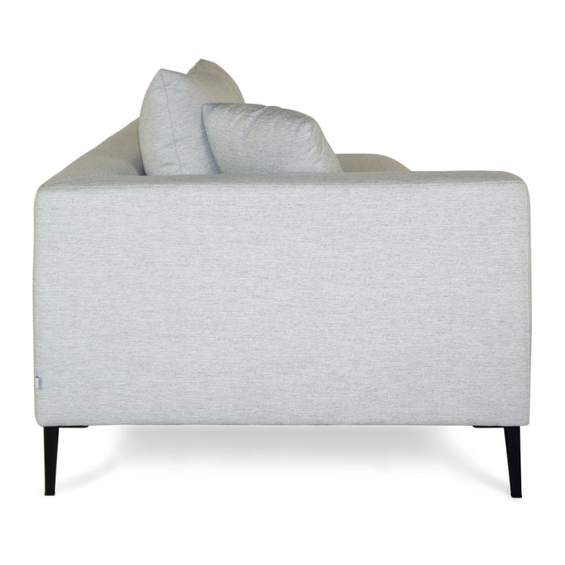 Die Füße sind schlank und in schwarz gehalten, was einen modernen Kontrast zum hellgrauen Stoff bildet. Sie sind aus einem stabilen Material, wahrscheinlich Metall, das dem Sofa nicht nur eine solide Basis bietet, sondern auch die schlichte Eleganz des Designs unterstreicht.