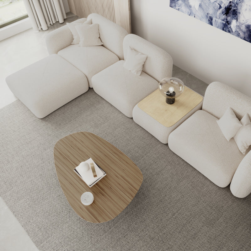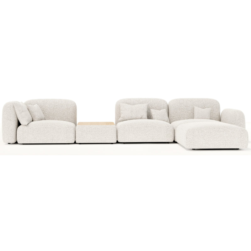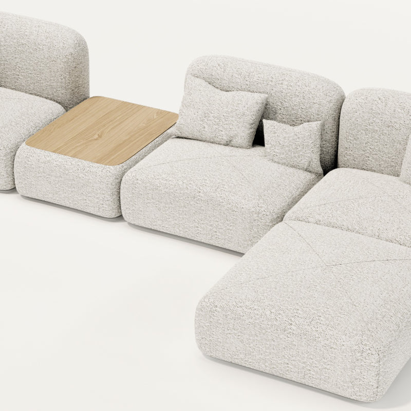 Die Modularität wird durch das integrierte Tischelement in einer natürlichen Holzoptik betont, welches nicht nur praktisch für das Ablegen von Gegenständen ist, sondern auch einen warmen Kontrast zum cremefarbenen Stoff bietet und die natürlichen Elemente moderner Innenarchitektur hervorhebt.