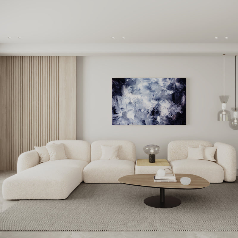 Die Form des Sofas ist modern und modulartig, mit abgerundeten Ecken und üppigen, weichen Polstern, die eine visuell beruhigende Silhouette schaffen. Diese Elemente sind strategisch so angeordnet, dass sie vielseitige Sitzoptionen bieten, von normalen Sitzen bis hin zu einer großzügigen Liegefläche.
