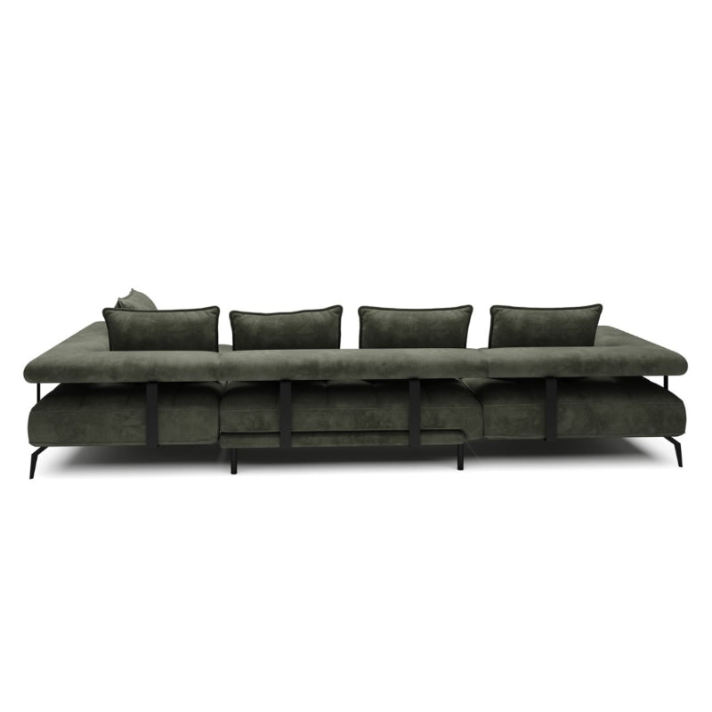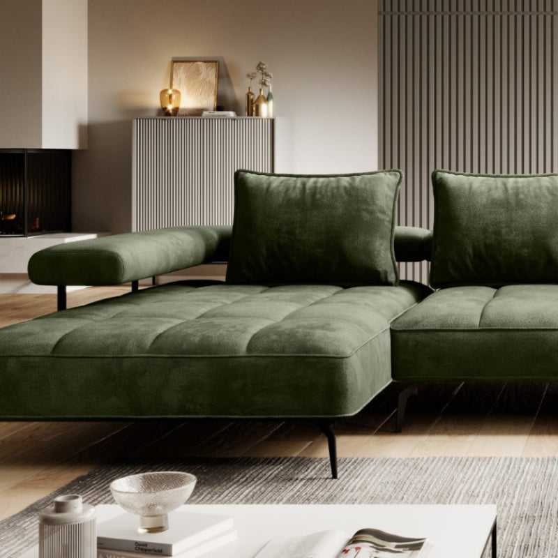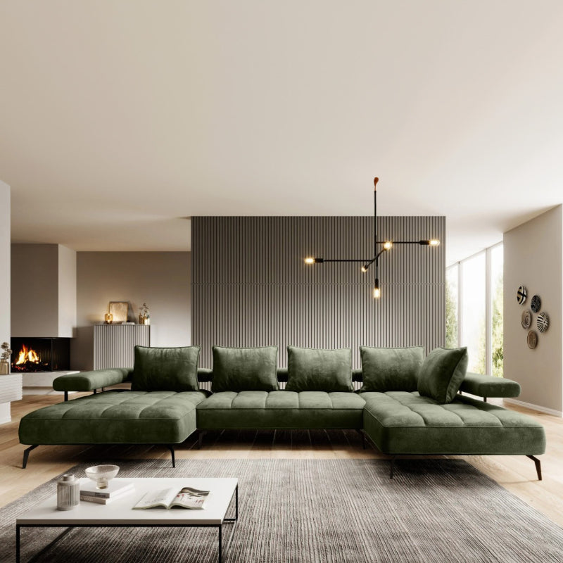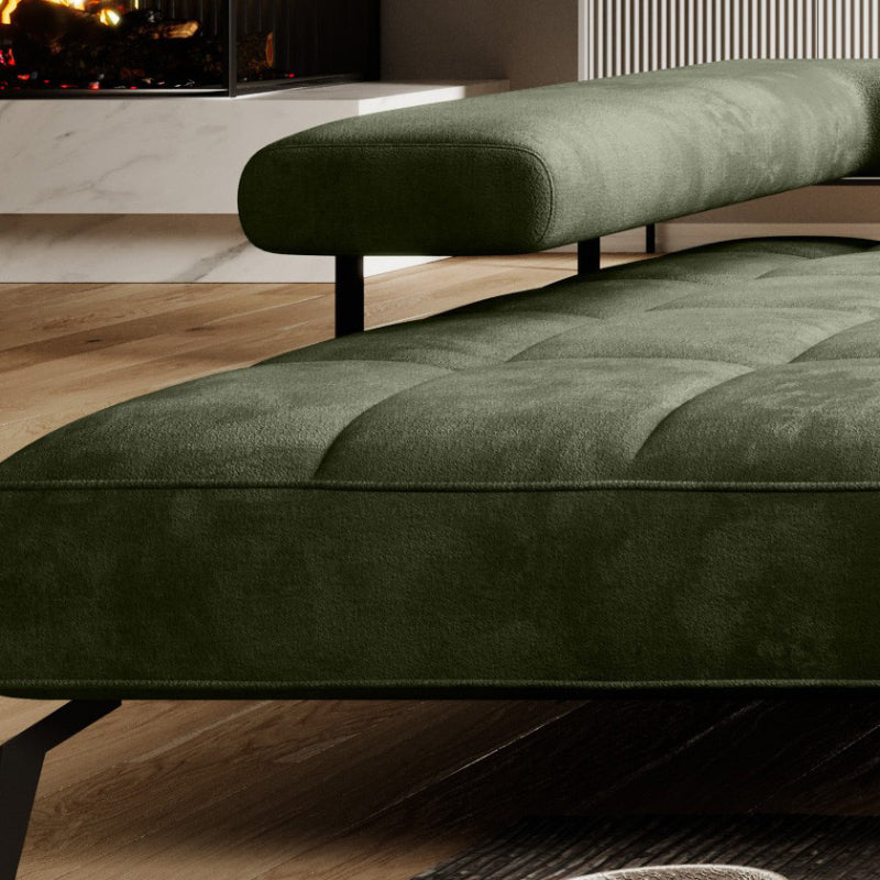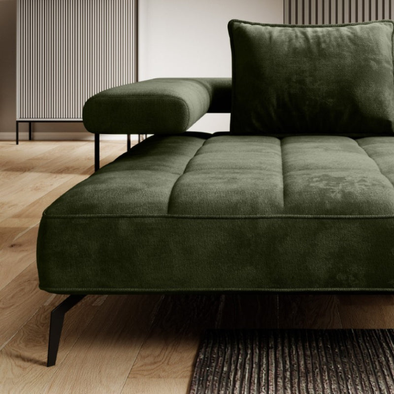 Das "SilkHaven" Sofa strahlt Luxus und Komfort aus. Seine großzügigen Proportionen bieten viel Platz zum Entspannen. Die Polsterung in einem tiefen Moosgrün verleiht dem Sofa eine edle und einladende Ausstrahlung. Die samtige Stoffoberfläche sorgt für eine weiche Haptik und betont die hochwertige Verarbeitung. Das Sofa steht auf schlanken, schwarzen Metallbeinen, die einen eleganten Kontrast zum üppigen Grün des Stoffes bieten und die schwere Optik des Sofas leichter wirken lassen.