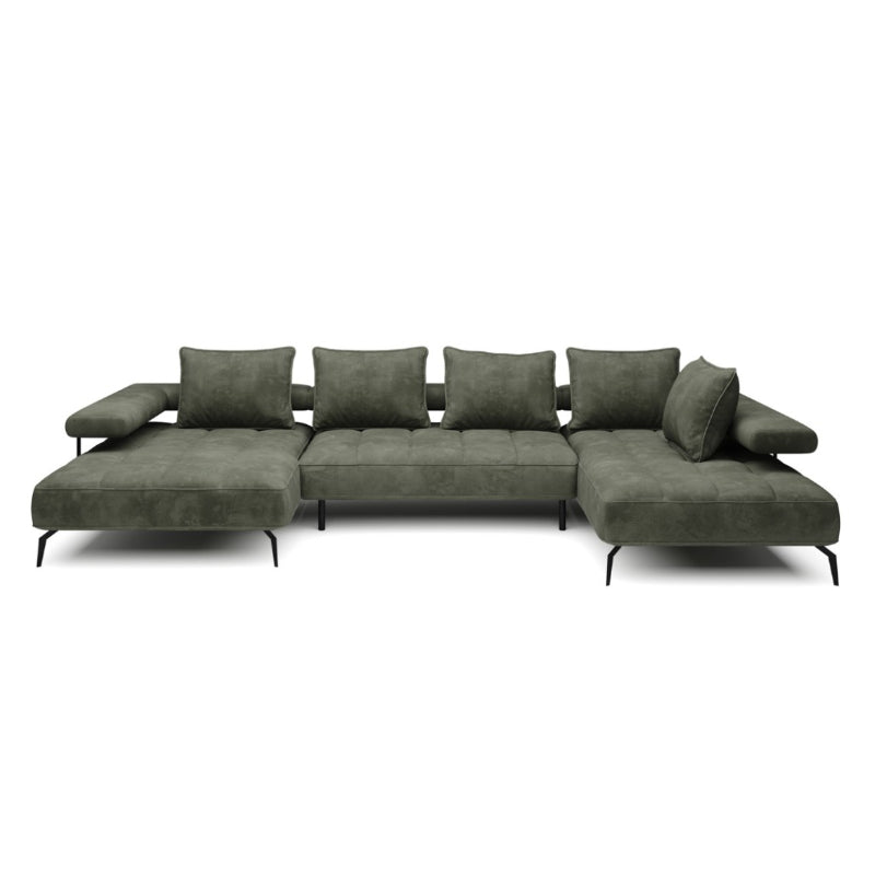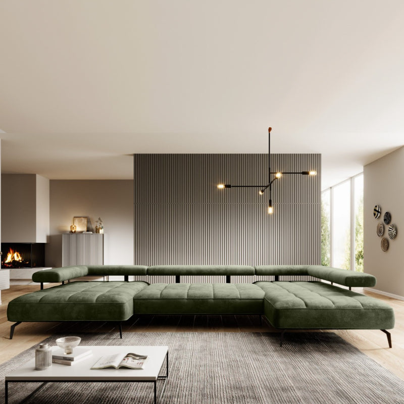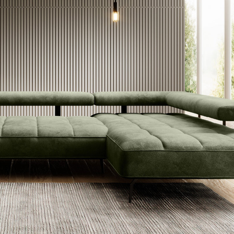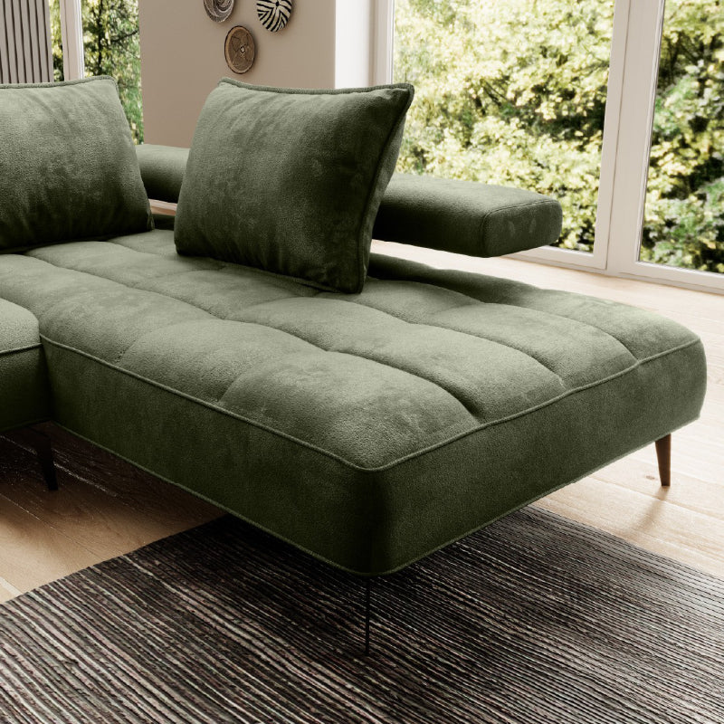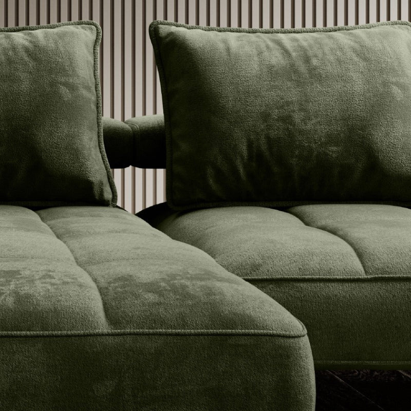 Das "SilkHaven" Sofa strahlt Luxus und Komfort aus. Seine großzügigen Proportionen bieten viel Platz zum Entspannen. Die Polsterung in einem tiefen Moosgrün verleiht dem Sofa eine edle und einladende Ausstrahlung. Die samtige Stoffoberfläche sorgt für eine weiche Haptik und betont die hochwertige Verarbeitung. Das Sofa steht auf schlanken, schwarzen Metallbeinen, die einen eleganten Kontrast zum üppigen Grün des Stoffes bieten und die schwere Optik des Sofas leichter wirken lassen.